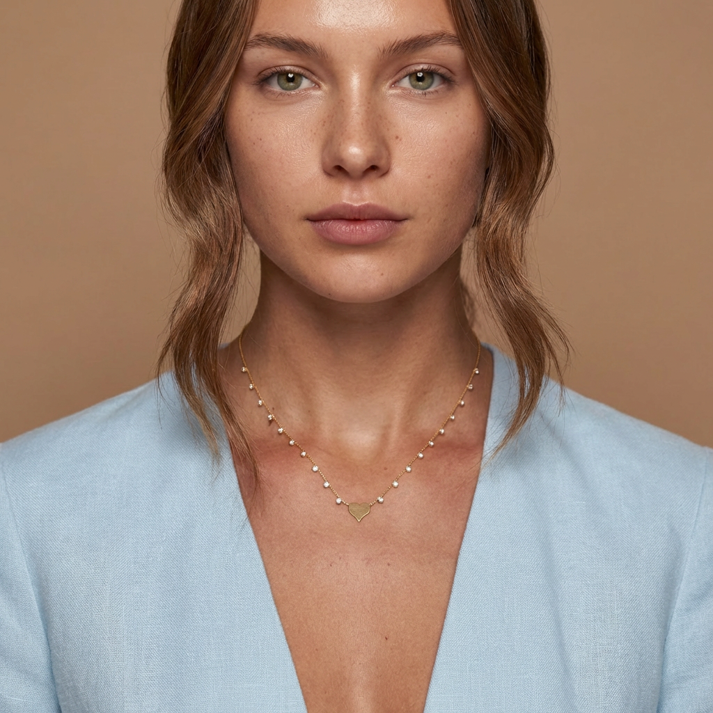 Delicate zirconia dots frame a shimmering heart pendant on this effortless layering necklace. The sparkly centerpiece catches light beautifully, while the minimalist design keeps things understated and chic. Perfect for stacking or wearing solo.